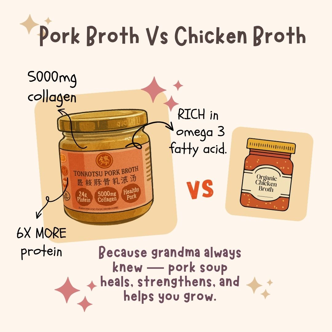 Compared to chicken broth, pork broth is naturally richer in collagen and minerals, making it more effective for healthy skin, strong joints, and post-illness recovery.