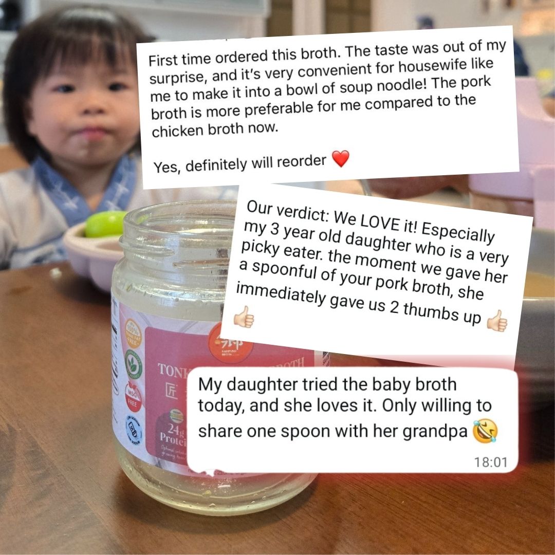 he most rejuvenating broth has arrived — Kampung Tonkotsu Pork Broth. Slow-simmered for 12 hours with 8 types of vegetables for natural sweetness, and loaded with antibiotic-free pork bones & trotters. Each jar is packed with 24g of protein, 0 trans fat, plus collagen & Omega-3 fatty acids — helping your skin to glow, your body to recover & providing your kids the nutrients they need for growth.