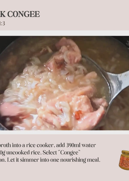 Method 4 – Comforting Congee 🍚. Pour broth into a rice cooker, add 390ml water and 100g uncooked rice. Select “Congee” function. Let it simmer into one nourishing meal.